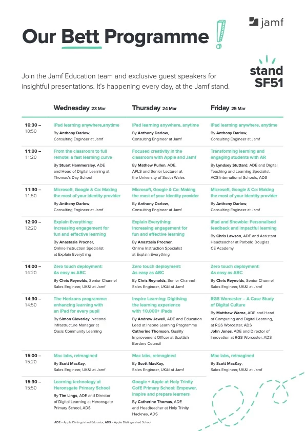 Come and join us at stand SF51, located near the Arena in the South Hall. See a full list of events here or the attached Jamf BETT 2022 Programme.