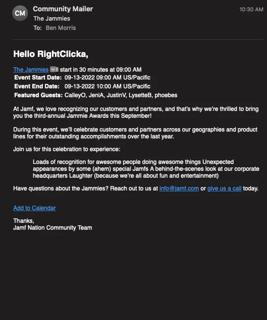 Have questions about the Jammies? Reach out to us at info@jamf.com or give us a call today.