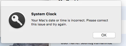 "System Clock - Your Mac's date or time is incorrect. Please correct this issue and try again."