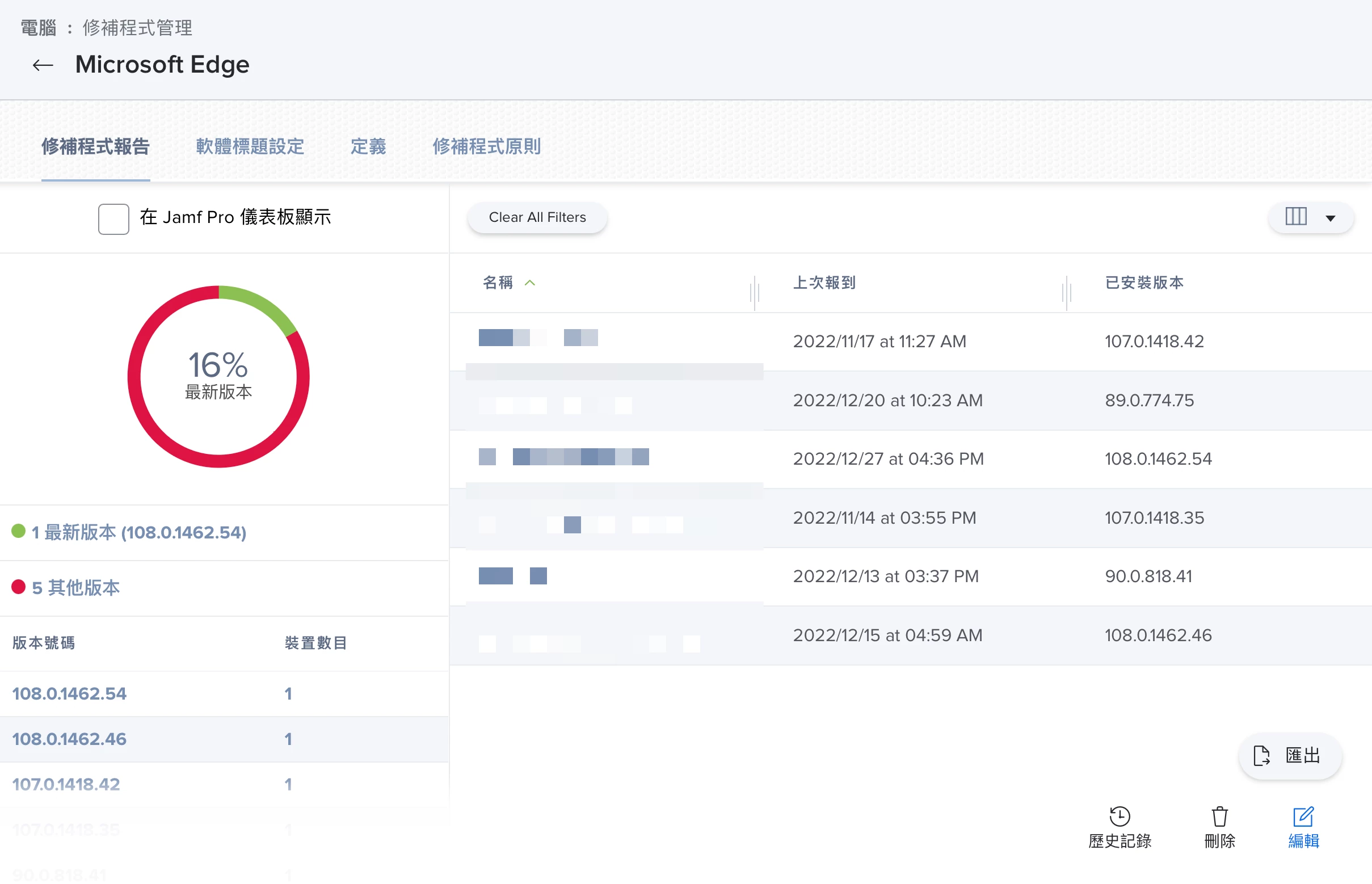 你可以在 Jamf Pro > 電腦 > 修補程式管理中使用此功能。Patch Management 給予 IT 人員更多彈性的設定,你可以只把 Patch Management 當做儀表板使用,了解公司 Mac 機隊裡某個軟體的版本使用情況。Jamf Pro 也會自動的幫你追蹤某軟體的最新版本號,你只需要把相對應版本的安裝程式上傳至 Jamf Pro 裡,再制定 Patch Policy 就能開始部署。