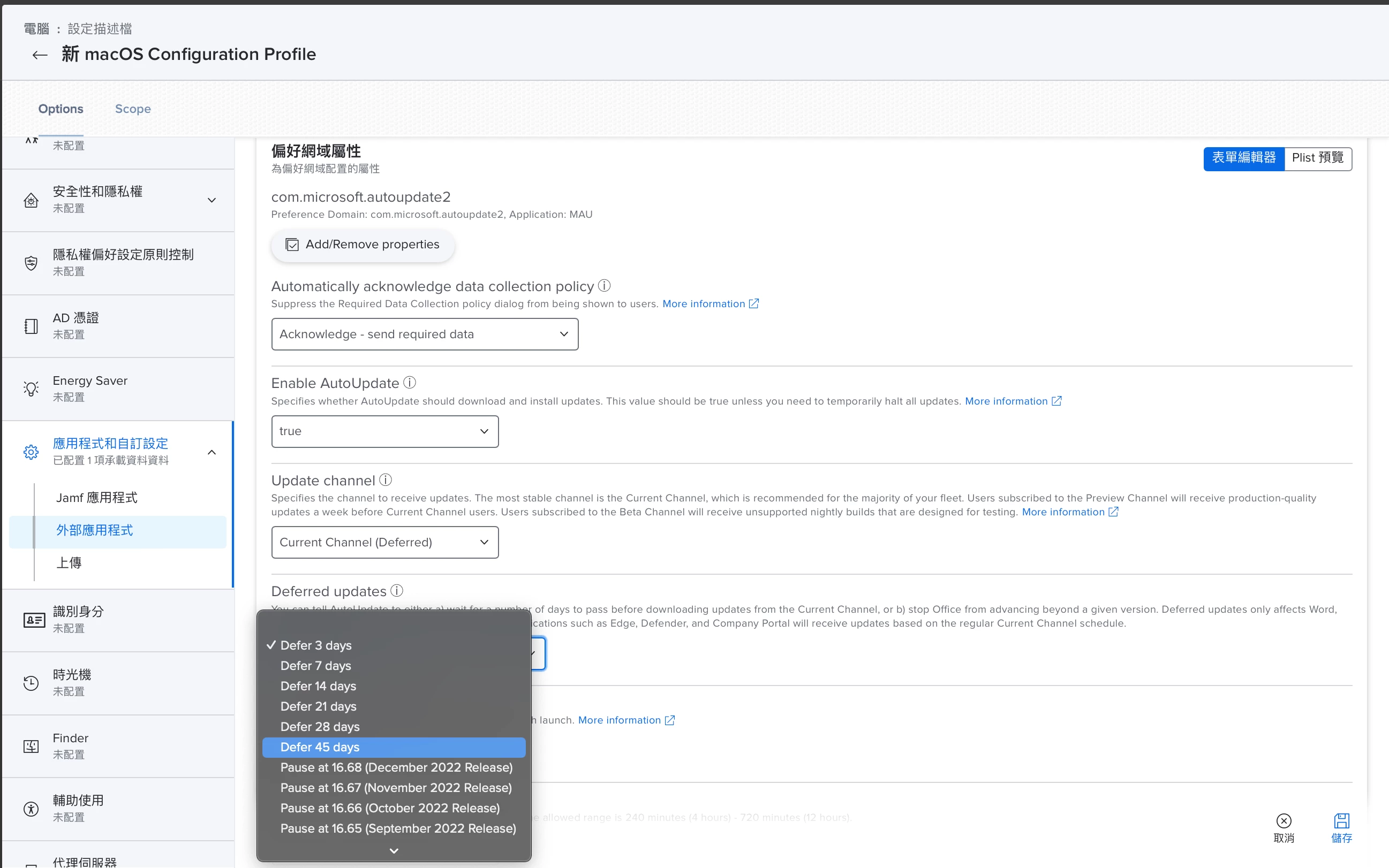 以 Microsoft Office 為例好了,從 Office 2019 以後,Microsoft 就推出了好幾個新的頻道,只要利用 Jamf Pro 設定 Microsoft AutoUpdater 的頻道,就能做到: