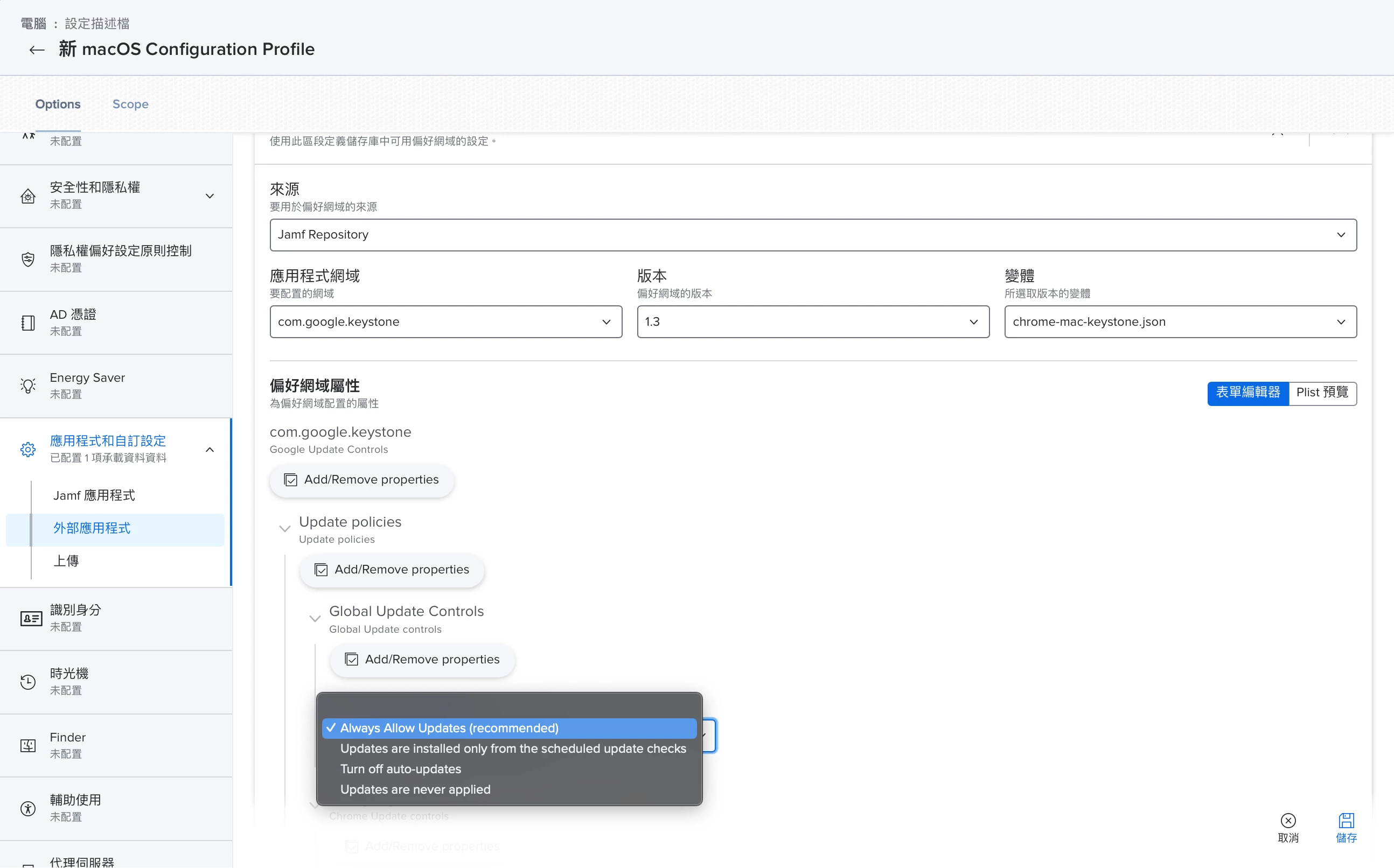 除了 Microsoft 以外,Google 也有自己的更新程式。Google 也發了一篇文章在講大量修補的方式:管理 Chrome 更新設定 (Mac)。Jamf Pro 也很貼心了做上選擇介面,讓 IT 管理員不用自己消化 XML,直接在 Jamf Pro 上就能選擇需要的修補政策。
