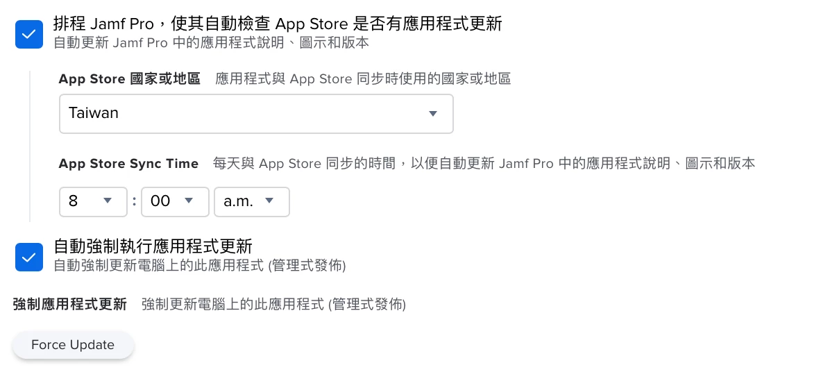 在選擇「排程 Jamf Pro,使其自動檢查 App Store 是否有應用程式更新」後,Jamf Pro 會自動跟 App Store 檢查是否有新版本。若有新版本且有勾選「自動強制執行應用程式更新」時,使用者電腦上的該軟體就會被強制更新至最新版。或是能用手動的方式點選「Force Update」,讓裝有從 App Store 下來的該應用程式都對齊 App Store 的版本上去。