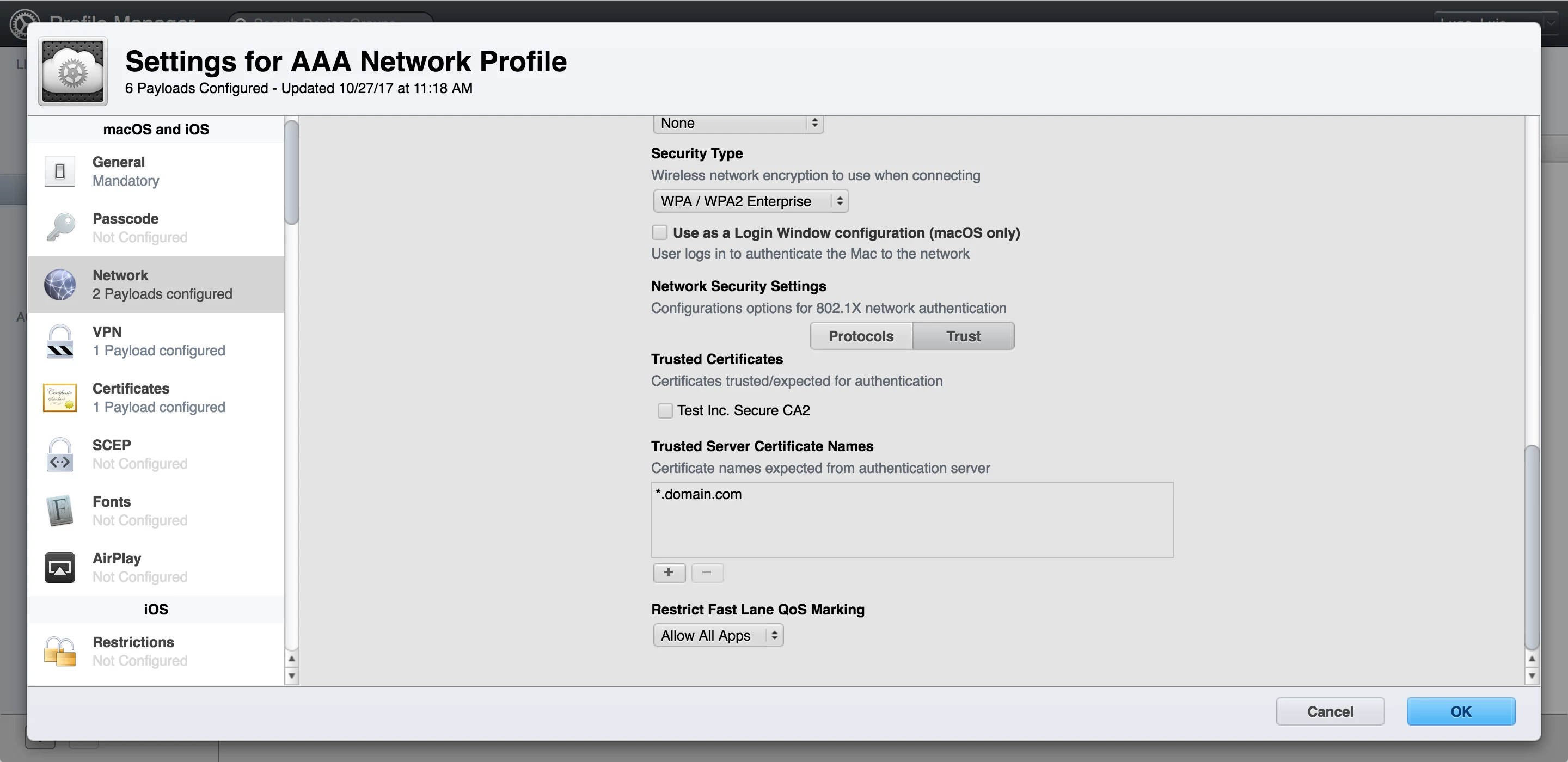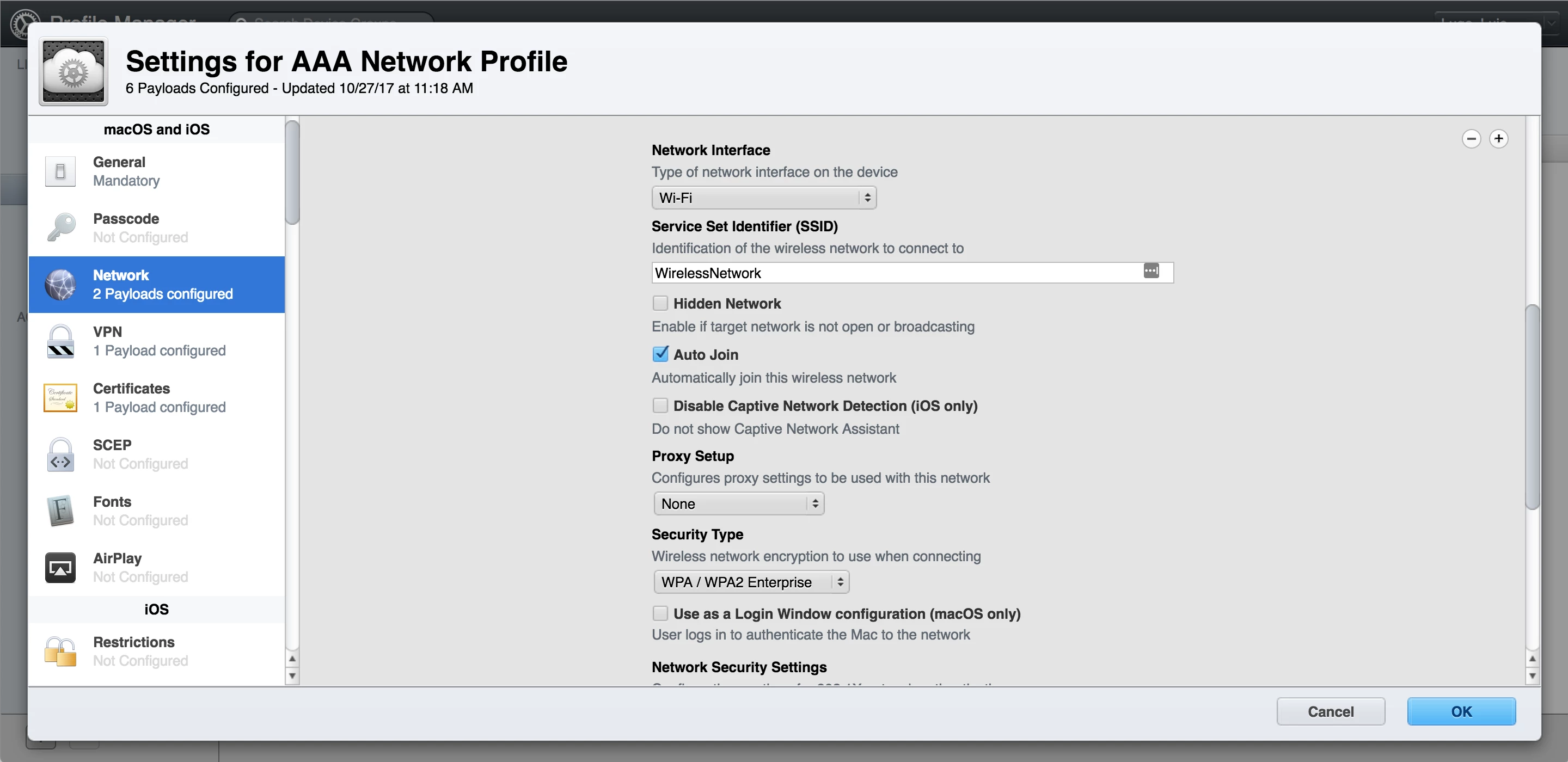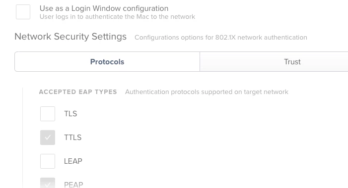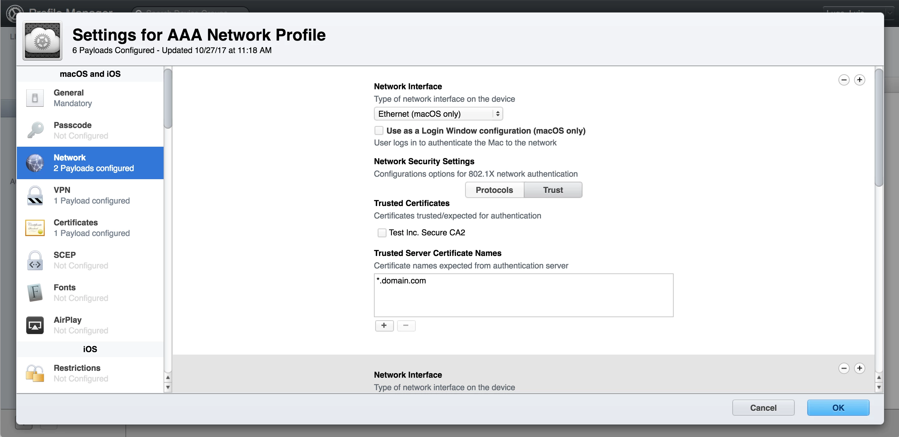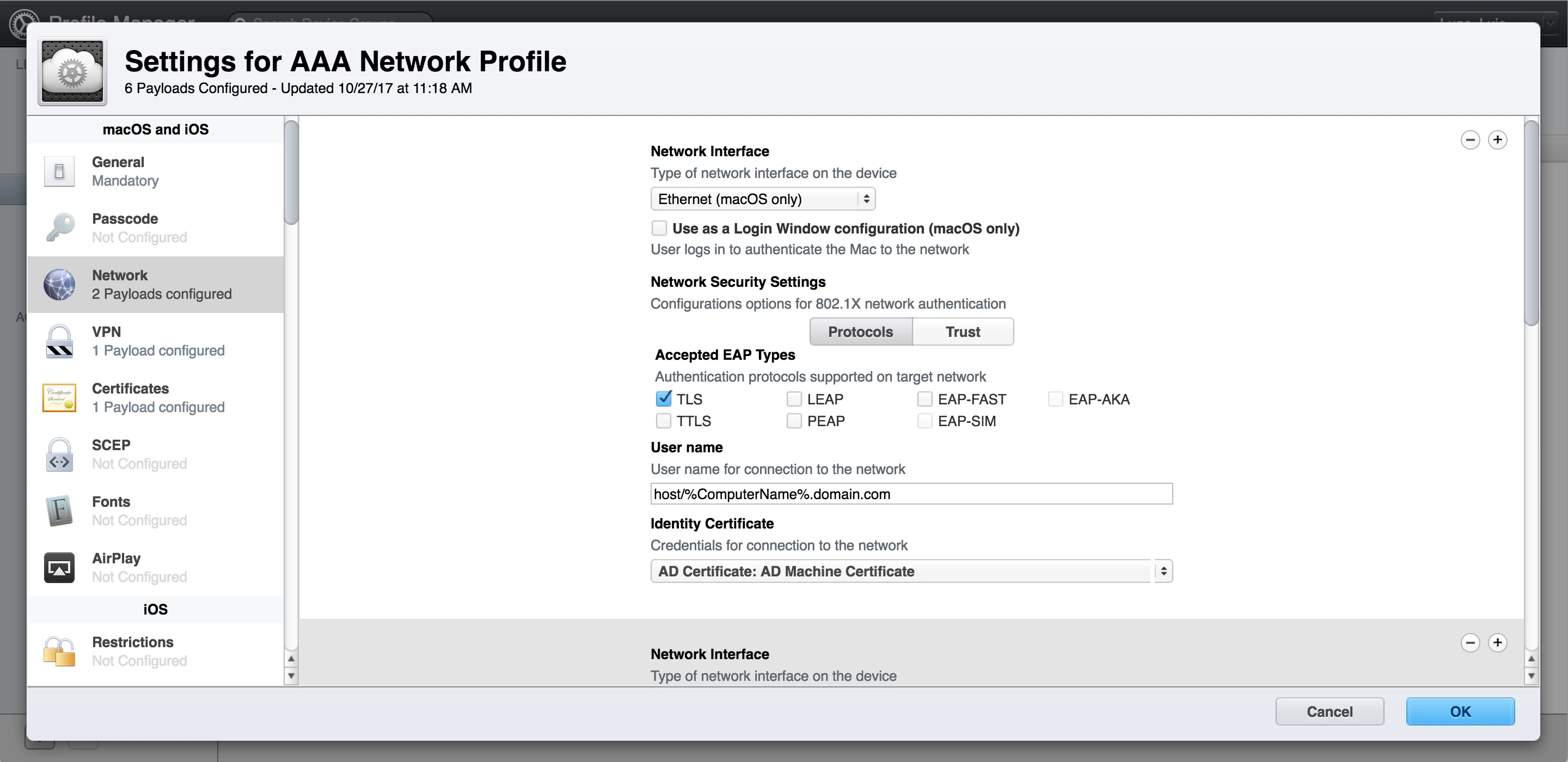 Hi, I am trying to setup 802.1X authentication for our ethernet and wifi network. with JSS configuration profiles, I setup Certificate(RootCA), AD and Network. I was able to get the certificate from our Root CA. (the cert it gets is like hostname.ad.corp. , the FQDN, I asked my enterprise team, they said the cert must to have FQDN, but he can add UPN as well). however it cannot connect with the correct 802.1X profile.