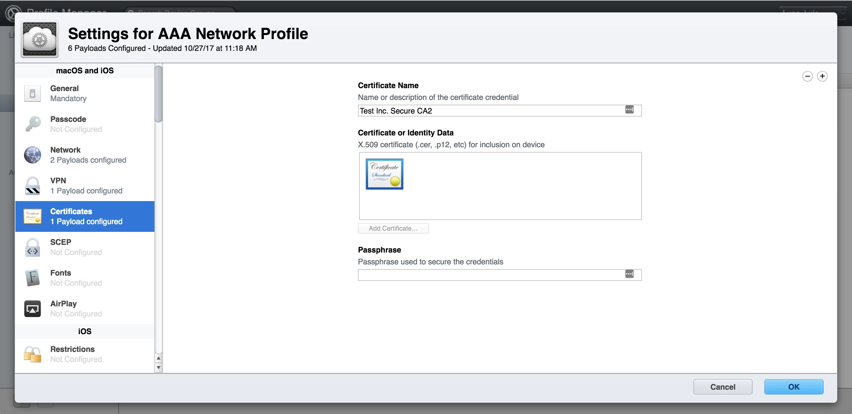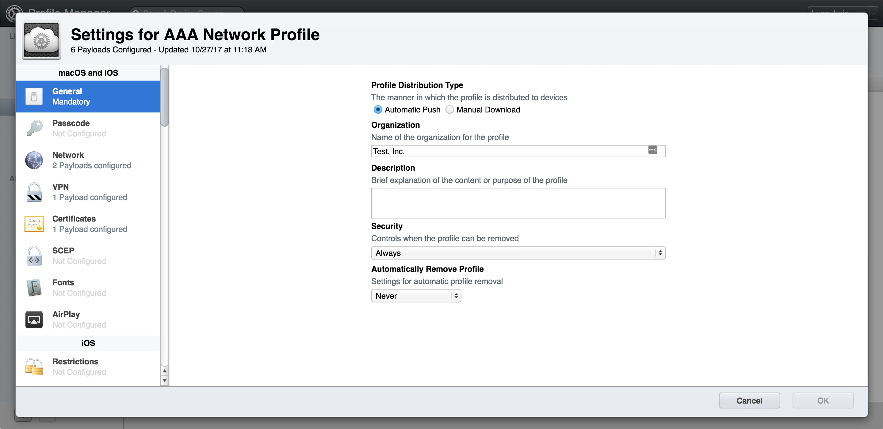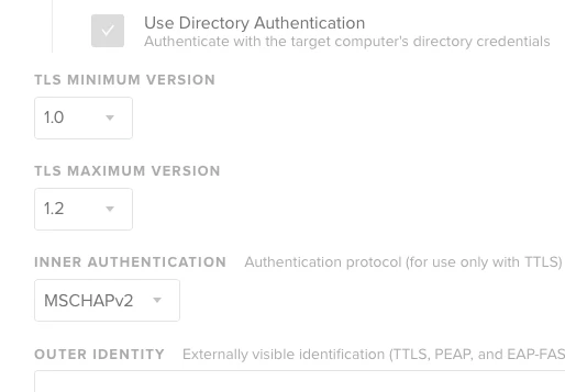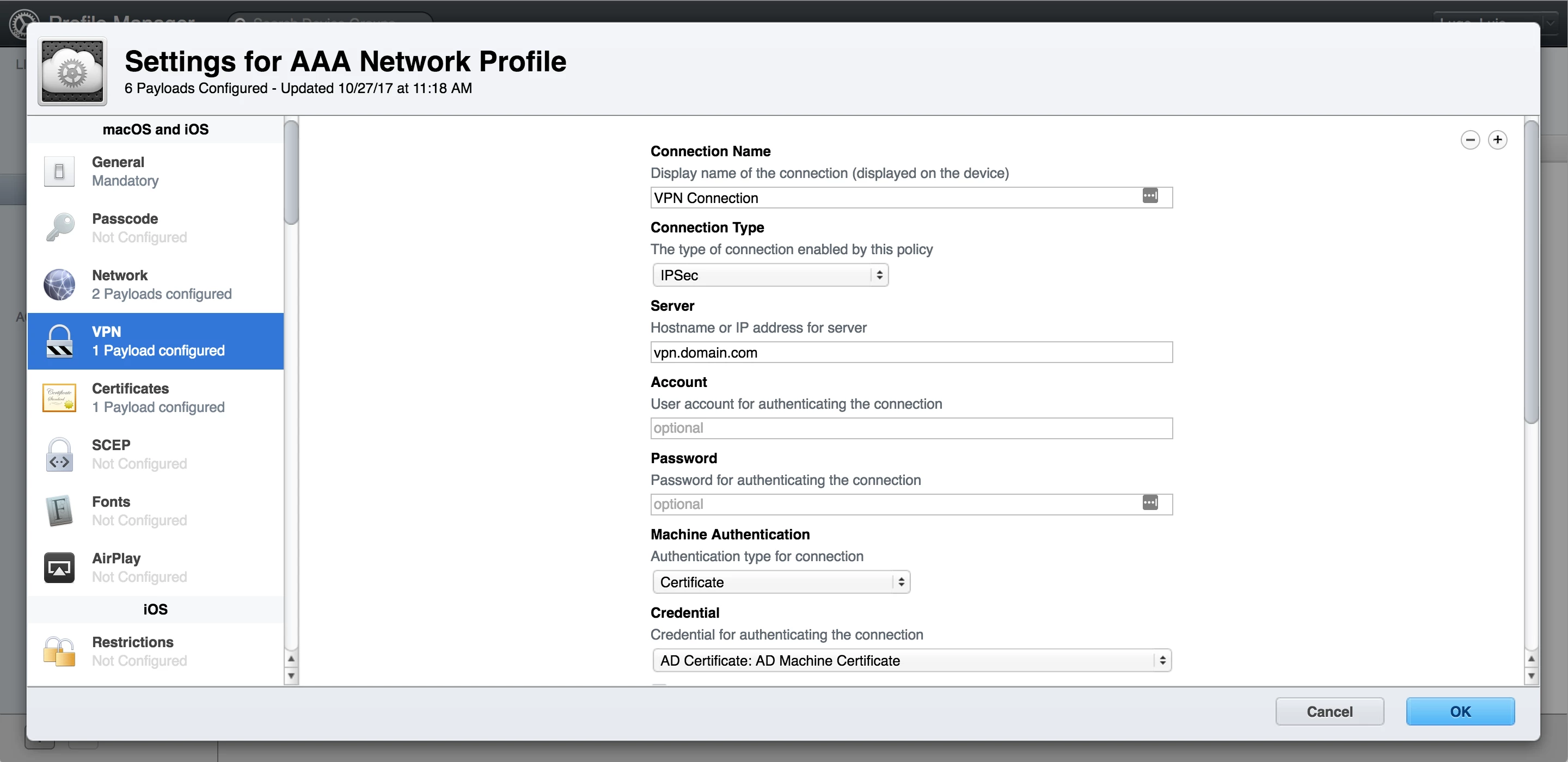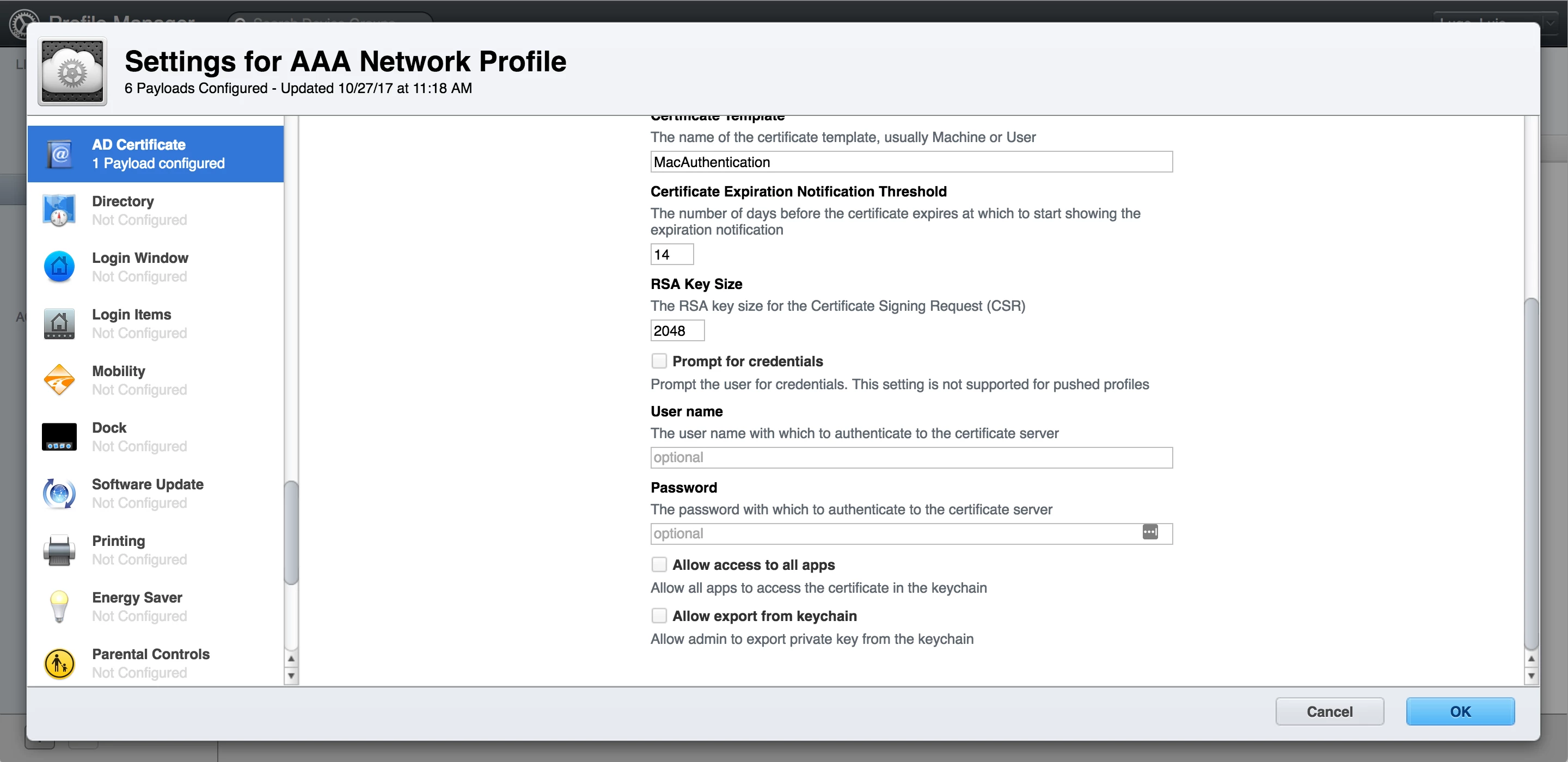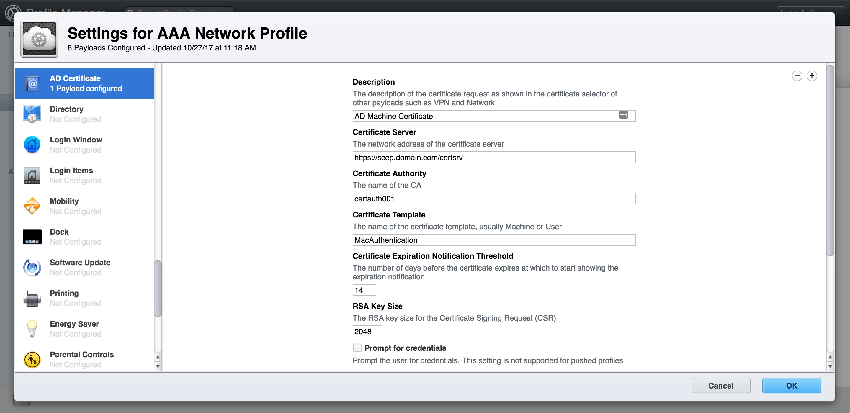 Hi, I am trying to setup 802.1X authentication for our ethernet and wifi network. with JSS configuration profiles, I setup Certificate(RootCA), AD and Network. I was able to get the certificate from our Root CA. (the cert it gets is like hostname.ad.corp. , the FQDN, I asked my enterprise team, they said the cert must to have FQDN, but he can add UPN as well). however it cannot connect with the correct 802.1X profile.