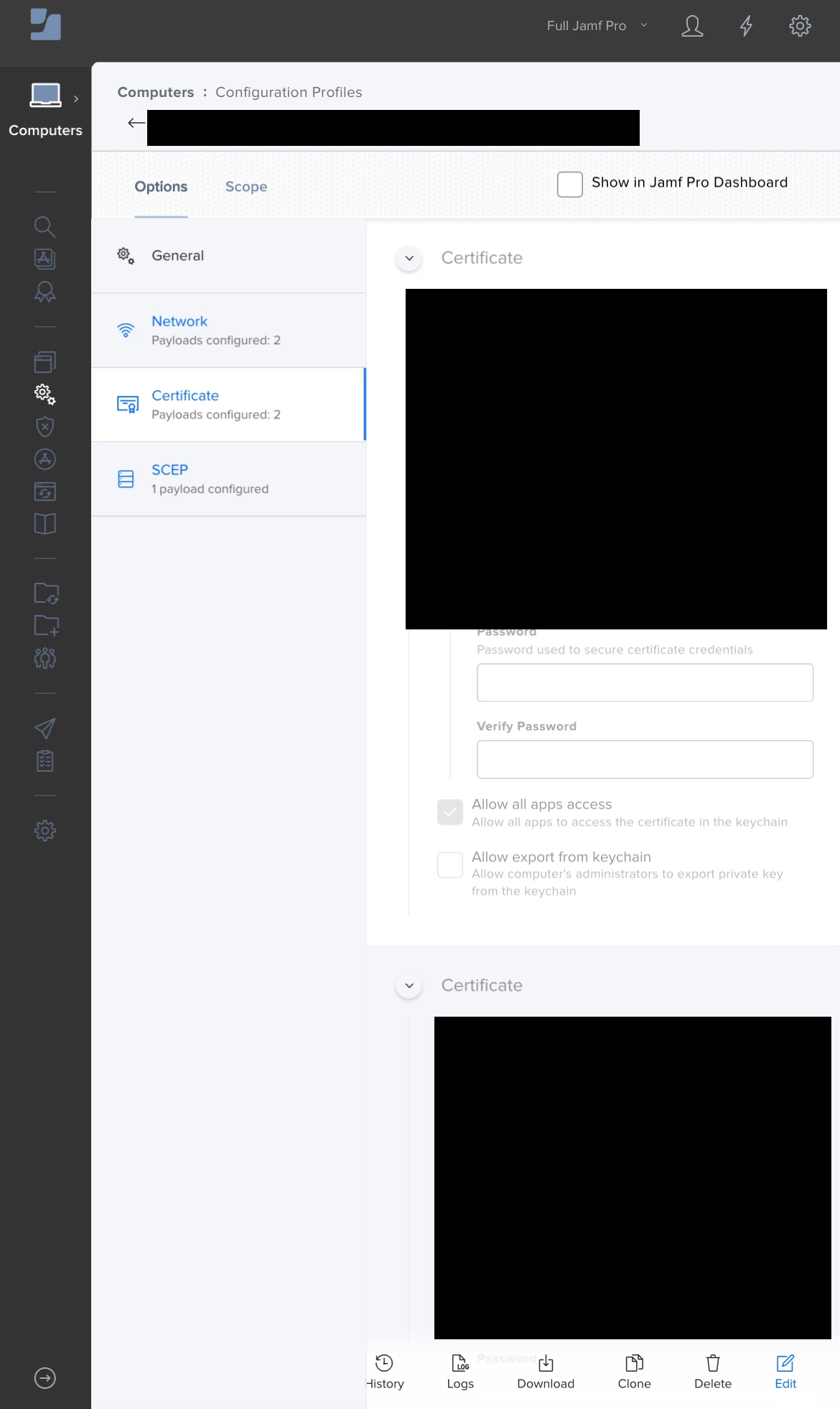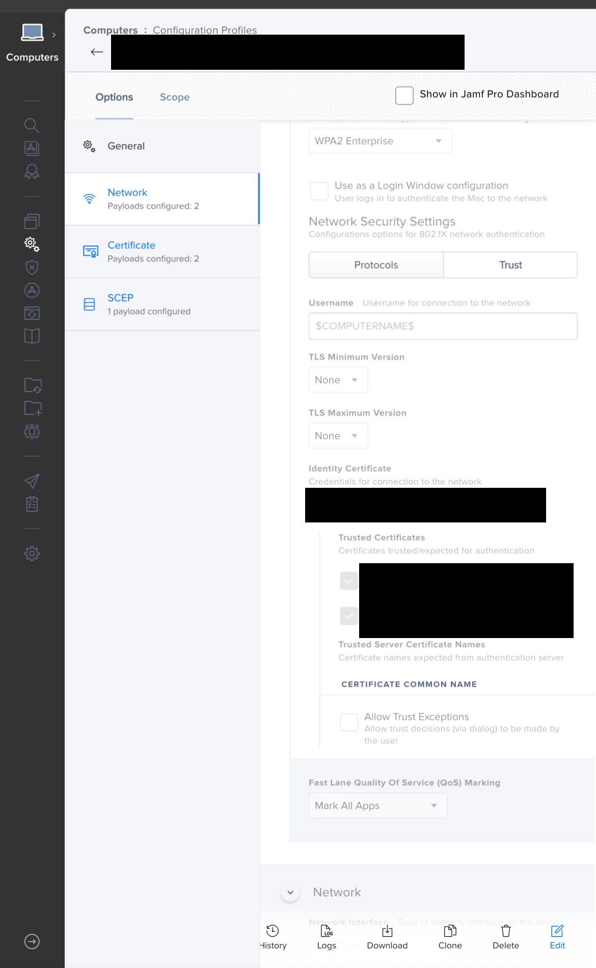 The network pane has all the settings for connecting to the 802.1x wifi and scep certificate pane is used for distributing the certificate to the system so that it could be used for authenticating the wifi .