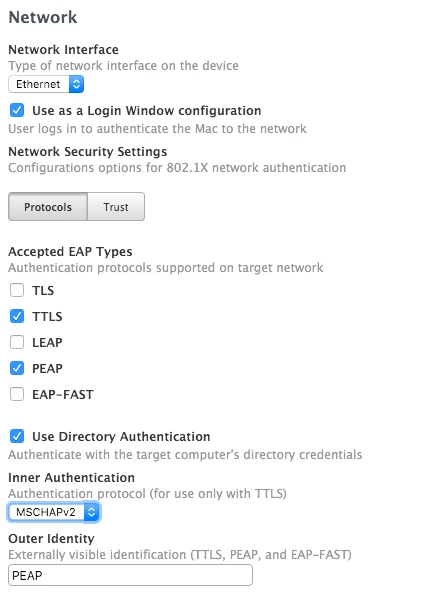 Because JAMF has defects in the network payload for both PEAP and TLS certificates I have hand made profiles, signed them, and uploaded them as read only. This is mostly working as expected. I have gone with the extra moving parts of TLS certificates because in this configuration any user can still select the machine certificate as the identity credential on additional ethernet interfaces. With a PEAP profile additional ethernet interfaces are dead in the water.