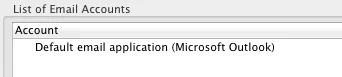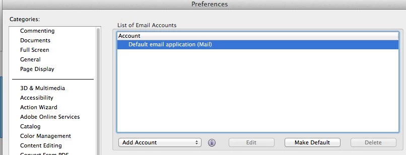 We are on 10.9.5 with Adobe Acrobat XI Pro vers.11.0.10. Would like to have the Adobe Acrobat default email account set to Outlook vers.14.4.9. Which is the standard email client. As you can see in the screen shot Mail.app is auto set for this. If we click on the Add Account this will not allow for MS Outlook to set.