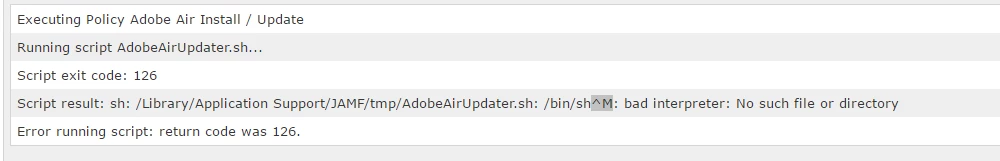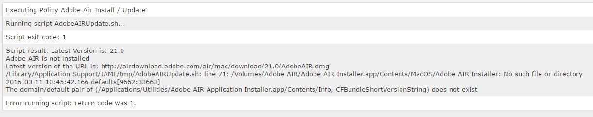/Library/Application Support/JAMF/tmp/Install Adobe Air Updates v2: line 71: /Volumes/Adobe AIR/Adobe AIR Installer.app/Contents/MacOS/Adobe AIR Installer: No such file or directory