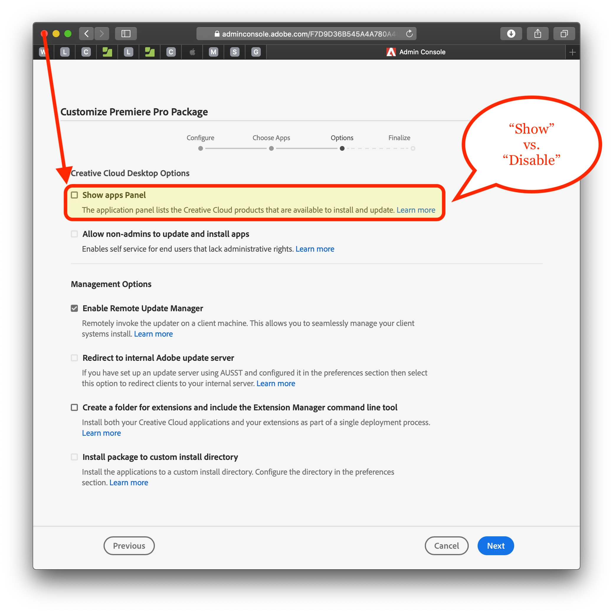 The best part? Adobe provides the end-user (with local admin rights) a link to instructions on how to re-enable the Apps panel.
