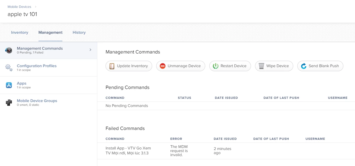 I having ATV 4 running 12.1 TV OS. When I Pushing an App to an ATV4,there was an error message "The MDM request is invalid.".