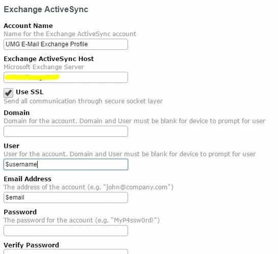 $USERNAME and $EMAIL are populated from their respective fields in the User and Location section of the device inventory, which will match the information for the corresponding Users entry. If either of those fields are empty, you'll need to look at your LDAP attribute mapping to get them imported.