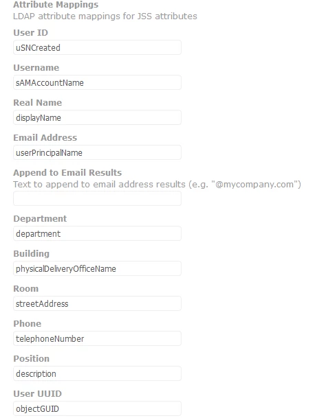 This is what our LDAP mappings look like. Using sAMAccountName for Username and userPrincipalName for Email are (IIRC) the defaults. I know a lot of orgs don't use the UPN, and change that mapping to mail(the attribute that links to the Email field in an AD user's properties).