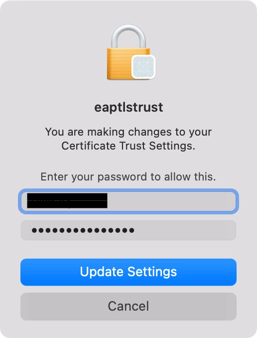 When our users connect to our corporate Wi-Fi, they get prompted for credentials and then this eaptlstrust message appears after. Is there a way to auto accept or make changes to this eaptlstrust certificate trust settings before hand?