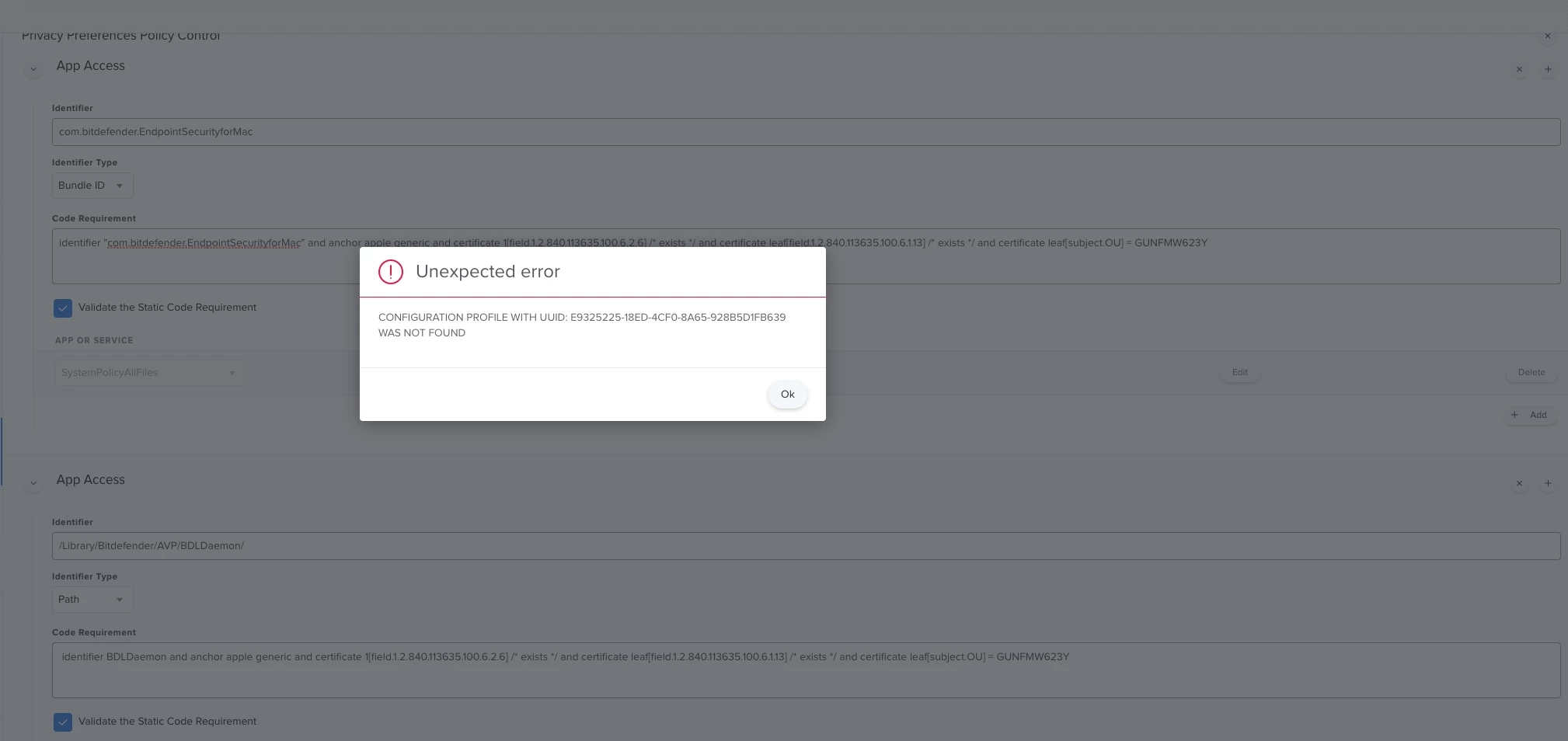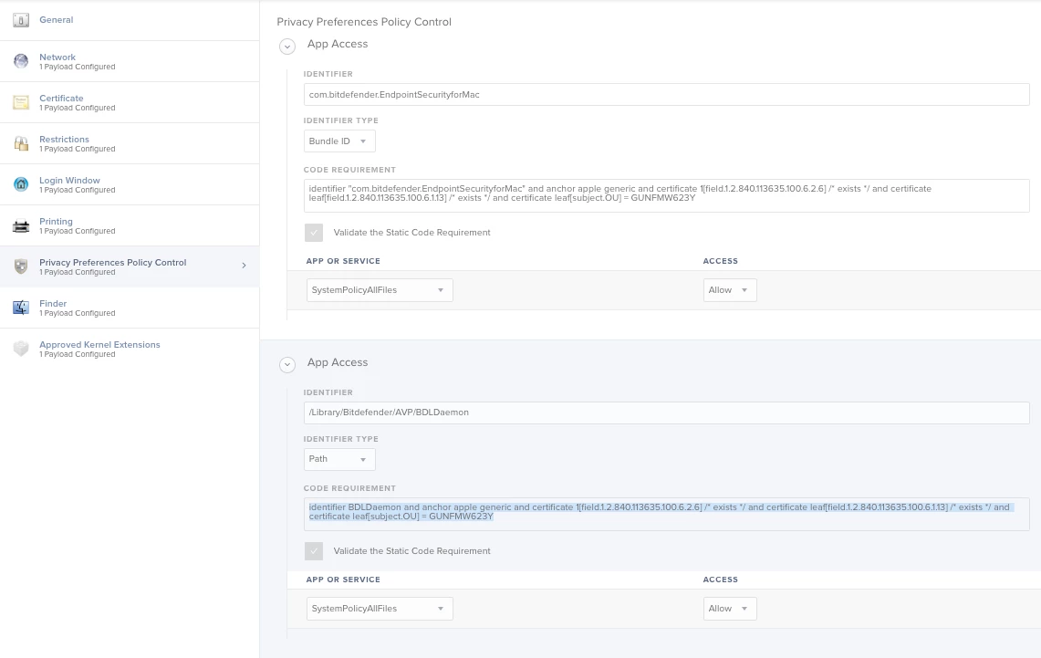 Code Requirement: identifier "com.bitdefender.EndpointSecurityforMac" and anchor apple generic and certificate 1[field.1.2.840.113635.100.6.2.6] /* exists */ and certificate leaf[field.1.2.840.113635.100.6.1.13] /* exists */ and certificate leaf[subject.OU] = GUNFMW623Y
