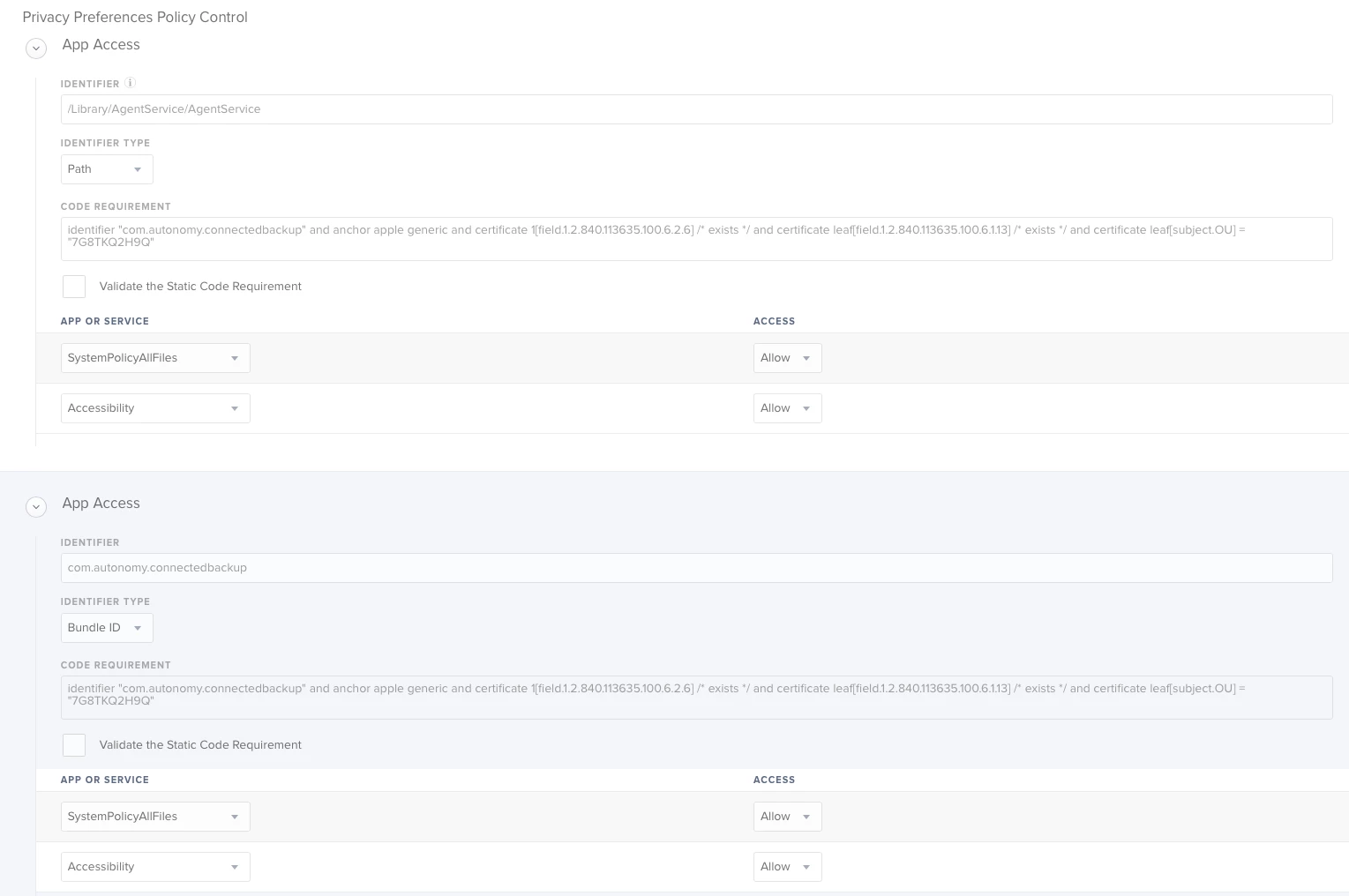 I used the Privacy Preferences Policy Control settings and have two App Access settings: