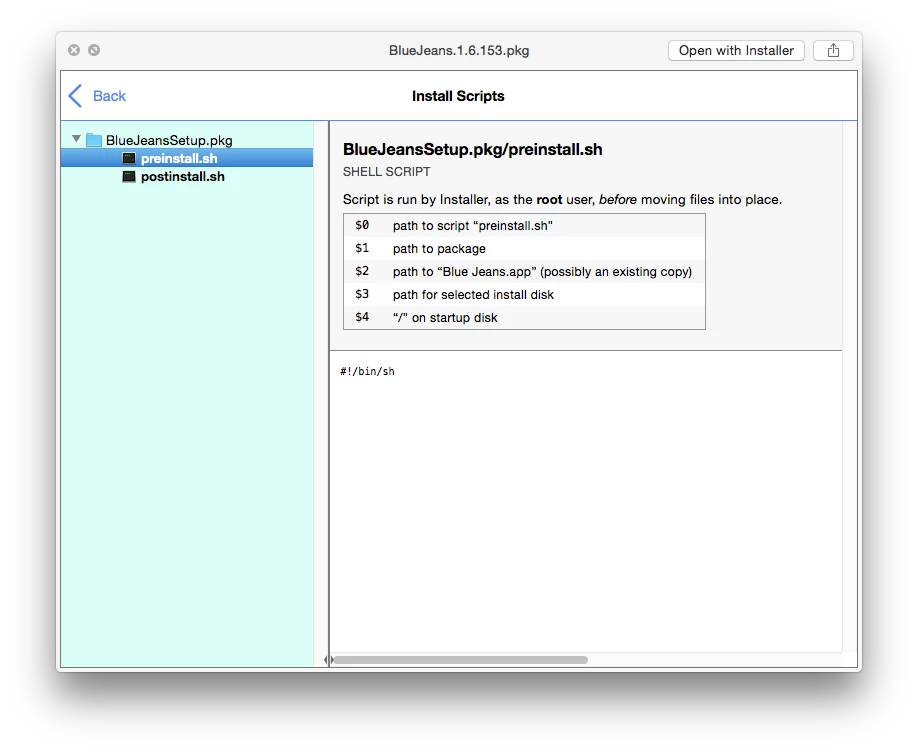 Sent Blue Jeans' support folks a link to this thread. Maybe we can shame them into providing the flat/signed PKG via direct link? Oh, and that empty preinstall.sh script? Might want to remove that. :)