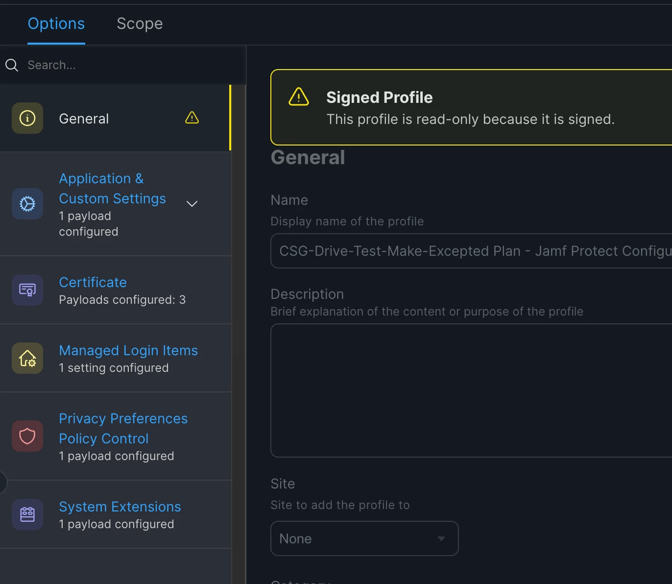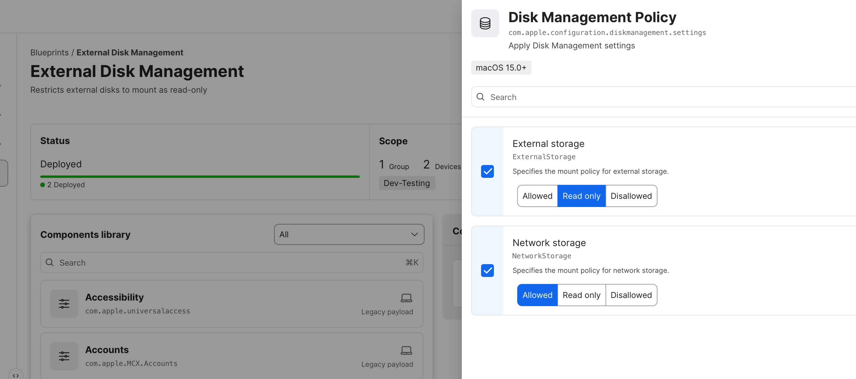 I am gradually learning how to work with blueprints. I have had success managing software updates with blueprints, so I decided to try out restricting external drives to read-only access. I want to stop controlling this using Proofpoint DLP (which I think is crapware) and start controlling it with blueprints.