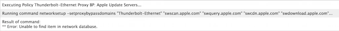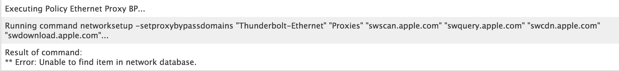 @Josh.Smith Dropped in the Network Service name (i.e., sudo networksetup -setproxybypassdomains "Thunderbolt-Ethernet" "swscan.apple.com" "swquery.apple.com" "swcdn.apple.com" "swdownload.apple.com"). but the error is the same...