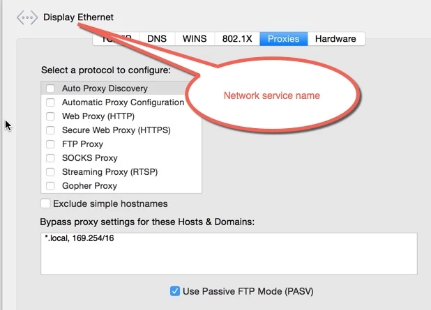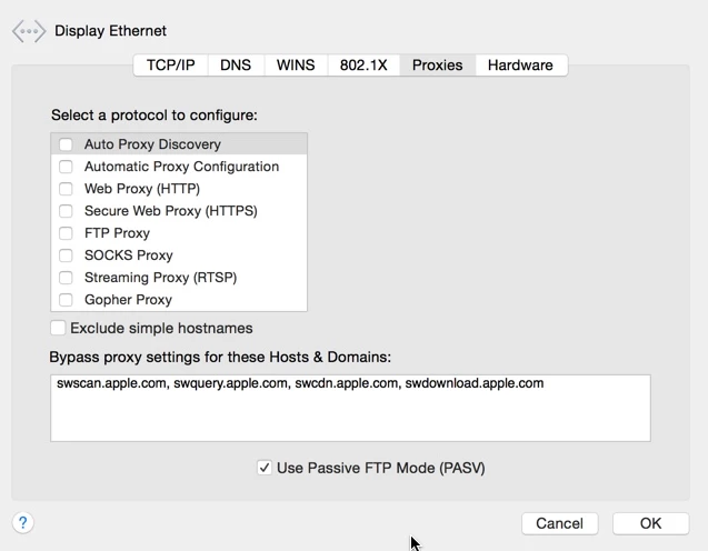 networksetup -setproxybypassdomains "Display Ethernet" "swscan.apple.com" "swquery.apple.com" "swcdn.apple.com" "swdownload.apple.com"