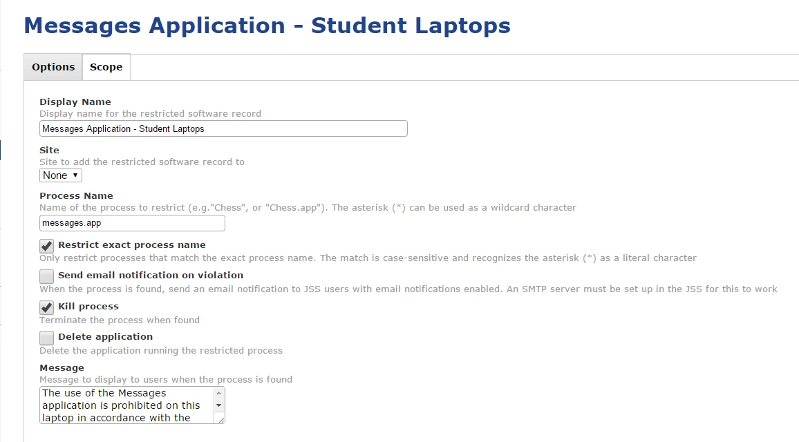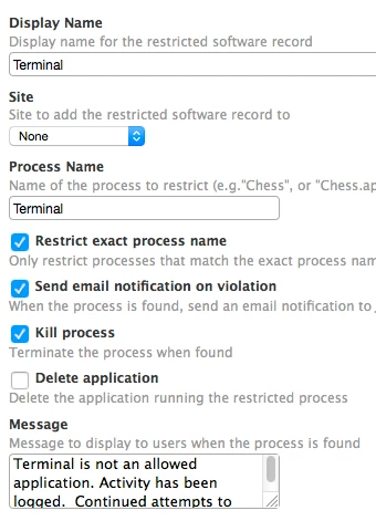 As far as checking off the box for "Exact Name", I have done so already and am still able to run the applications as a standard user after copying the messages.app, mail.app and facetime.app to the desktop and renaming them. Even with the process name not changing, we are still able to run all of the applications we created entries for under restricted software. The setting works fine when the app is tried to run from the applications folder so I know my JSS is doing something. I get my custom message as well. It is only once it is moved out of the applications folder.