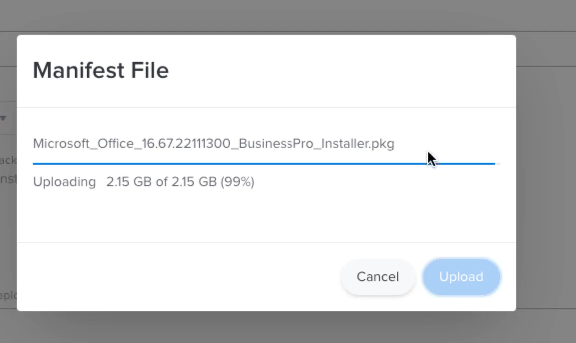 When I try to upload Microsoft Office BusinessPro installer it gets to 99% and then hangs. I don't seem to have any issue with any other packages, just this one. I tried leaving overnight on one attempt and it was still on 99% in the morning.