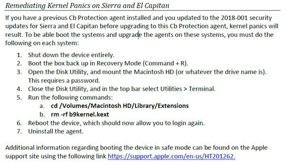 Has anyone found a fix for the Bit9 (Carbon Black Protect) or Carbon Black Response kernel panic? This was caused by having CB installed and installing the Security Update 2018-001.