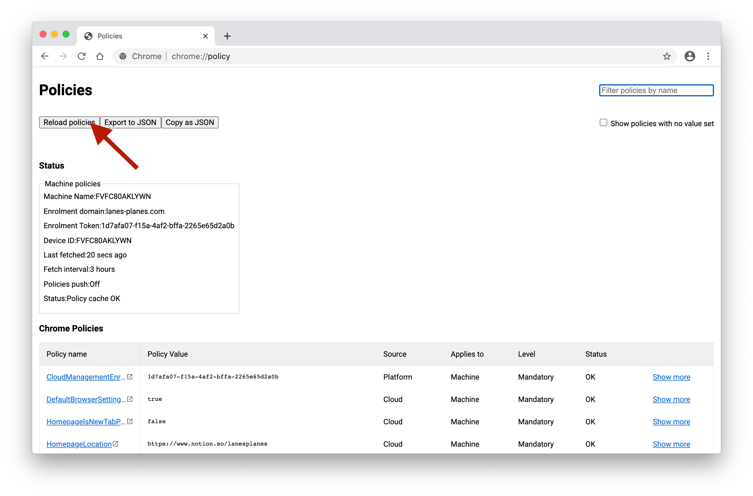 However, when I check chrome://policy, all pre-defined policies from CBCM show up fine, so I would assume that they got properly loaded by Chrome before. Odd thing: When I no click on "Reload policies" in this window, close and re-open Chrome, all settings (except for wallpaper, but let's forget about this one), are now properly applied.