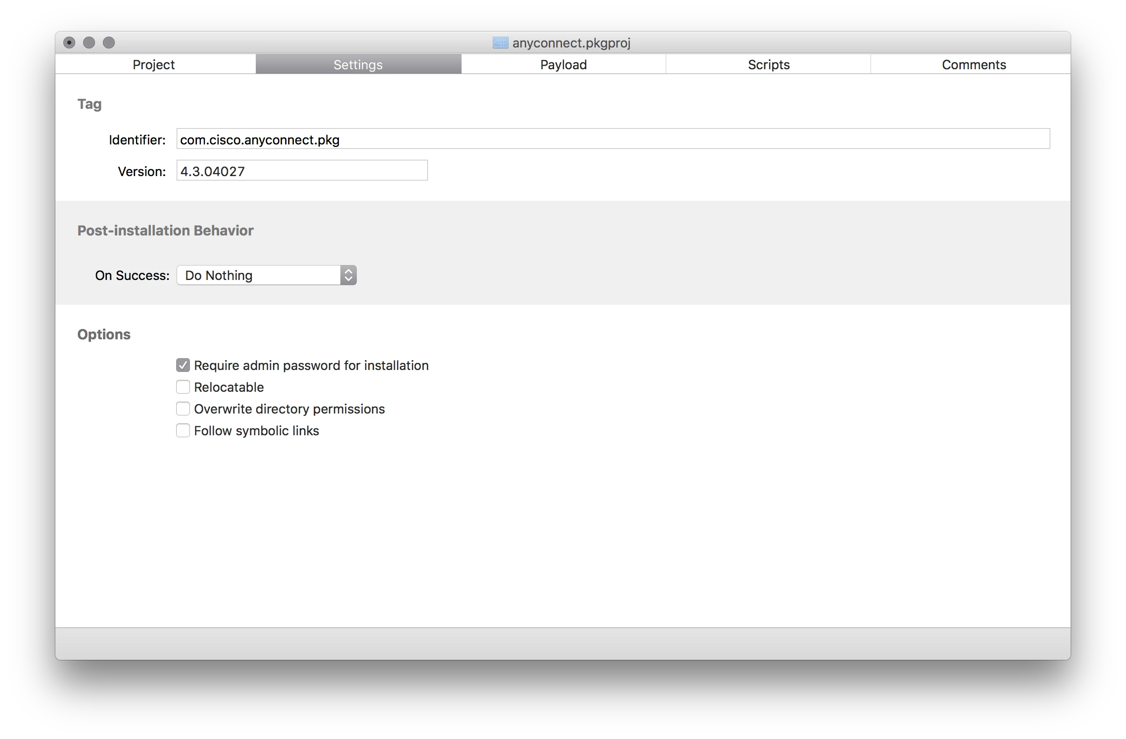Choose an identifier (ours is com.cisco.x.x because we are Cisco. I would use something unique to you) and supply a version number for your package. I make the version number match the version of AnyConnect: