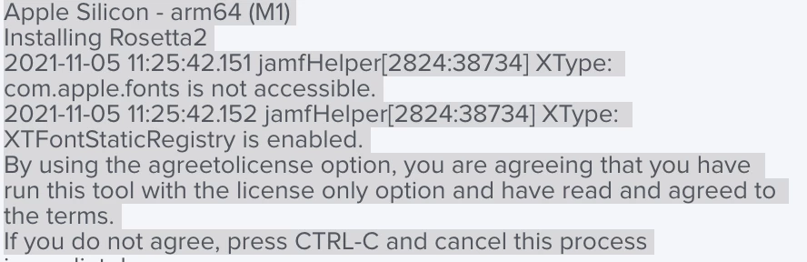 We also used jamfHelper in this workflow to display a splash screen before the Mac restarts to install the updates but as other people have mentioned, this issue seems to affect jamfHelper in Monterey Intel as well. If I run just the jamfHelper script in terminal it works but displays the 2 error lines related to fonts but if I run it in a jamf script it now fails so we're now using DEPNotify for the splash screen instead.