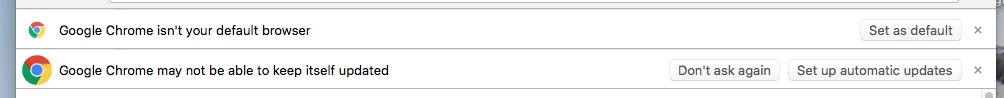 I'm using a Google Chrome Master Preferences file, and a com.google.chrome.plist file. (I have the plist in /Library/Preferences as I want those settings to apply to all users, but for them to be able to override as needed.) What I'm left with is a bit of underisable first-run behavior -- specifically, "Google Chrome isn't your default browser" and "Google Chrome may not be able to keep itself updated" bars: