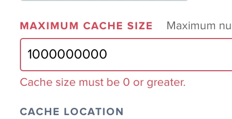 I wanted to run a test of a few machines with a smaller cache size (~10GB or so). It seems anything much larger than a 2GB size - in bytes - is rejected by the field
