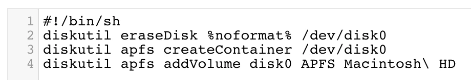 Hi everyone. Trying to write a script that deletes all partitions off the internal drive of an older MacBook Air running 10.12.6 then creates an APFS container with a new volume title "Macintosh HD". Here's what I have but it doesn't seem to be working.