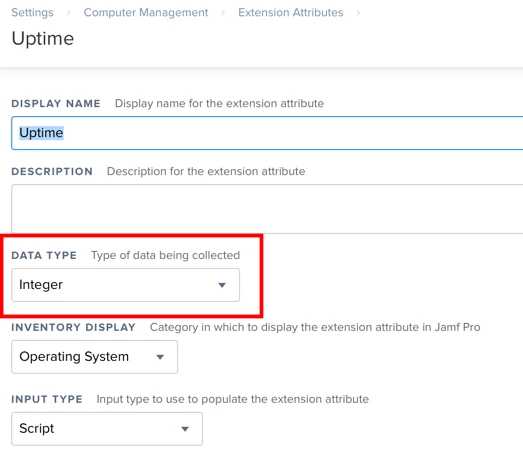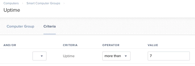 I am trying to create a smart group that will show me Macs that have been booted for more than 7 days. Many times, my team gets support tickets from users that would not have been necessary if they had rebooted their Macs at least once a week. I love that Macs can stay booted for a really long time. My record is 92 days, but to get there, I had to put up with some quirks and minor issues. I just wanted to see how long I could go between reboots. I don't want my users doing this, so I want to create a smart group for Macs that are booted up longer than 7 days, and then display a message asking them to please reboot soon. I have found extension attributes that will show me the up time, or last reboot, but when I go to create the smart group, the operator shows only is, is not, like, and not like. What I need it to show is something like "more than X days ago". Does anyone know how I get this? Maybe I'm using the wrong extension attributes?