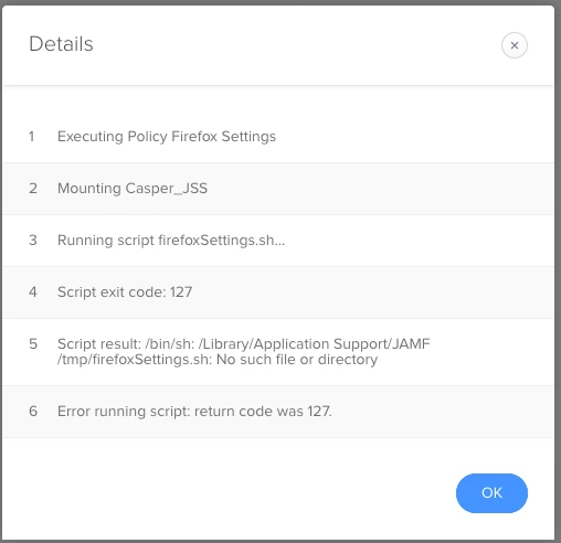Hello, Looking over this page it says you can use the defaults command to deploy settings to firefox. https://support.mozilla.org/en-US/kb/managing-policies-osx-desktops. I created the script below but keep getting a "no such file or directory" (see attached) error when deploying through Jamf. When I run locally it seems to work fine. I use this same exact format for Chrome to deploy settings and that works great. Any ideas?