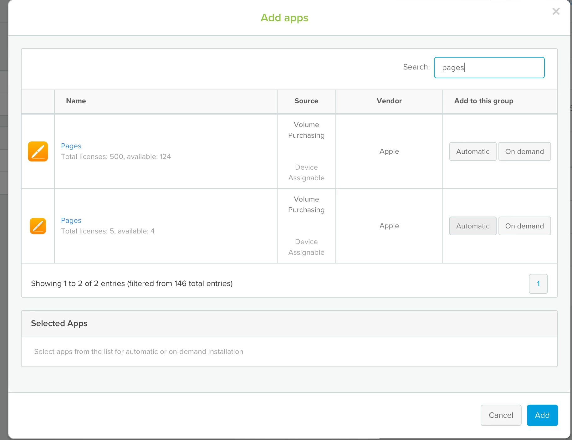 If you are adding apps to a Device Group using the Add + button, if you have an app like Pages that is available for both iOS and Mac, there is currently no way in Jamf School to distinguish between the app types, unless you understand the subtle design differences between the icons or have a difference in the number of licences.