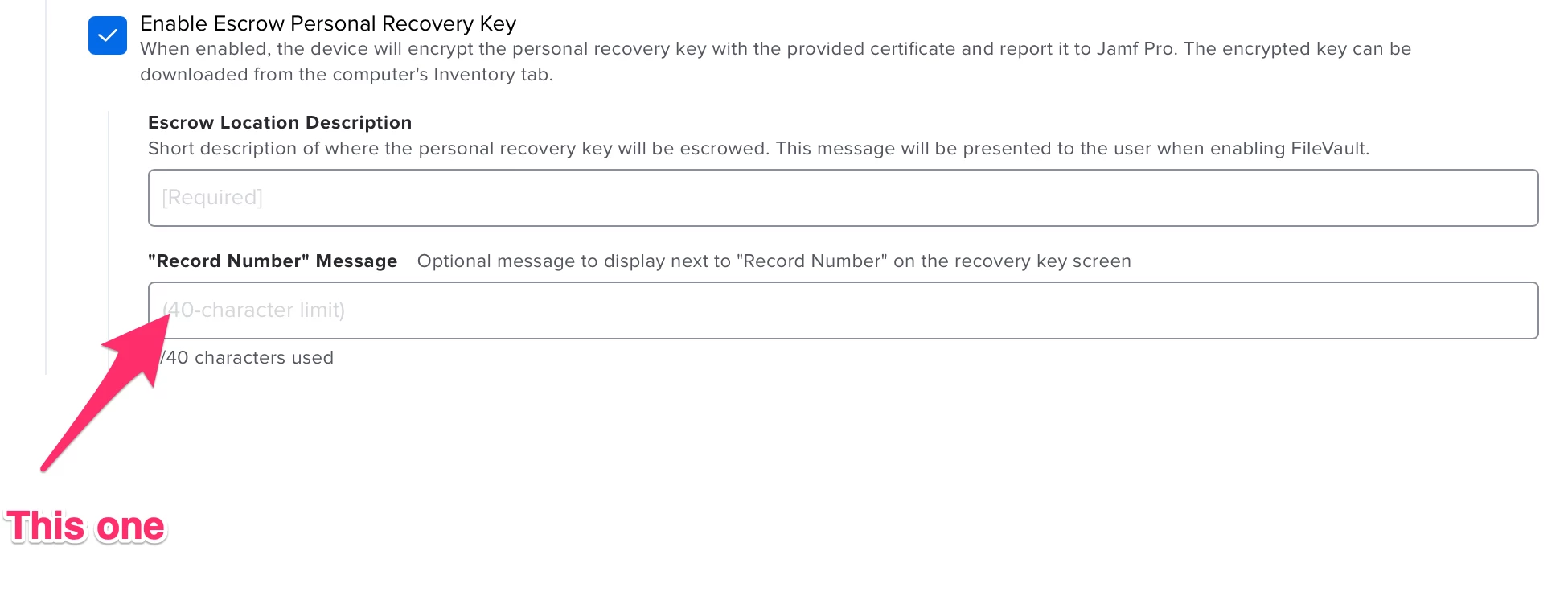 Now with Jamf Pro, that is all not needed at all, as the location is always the Jamf Pro server and there the recovery key is stored in the inventory record. Therefore, both the location description and record number are not really needed, but displayed to the user if he fails to log in. I do not know why this is hidden behind a "show key" button or I could be totally wrong, but from my understanding of Jamf Pro and the MDM Profile spec, this is what makes sense.