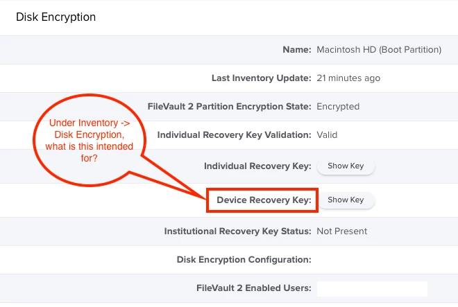 The Jamf Pro Administrator's Guide lists "Device recovery key" in a table (Viewing and Editing Inventory Information for a Computer) but doesn't describe it at all. There's nothing in the Jamf Knowledge Base either.