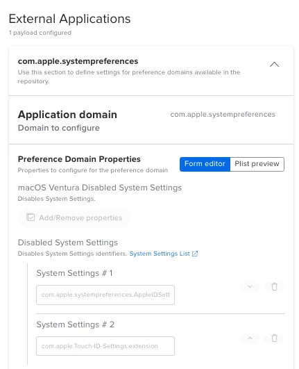 The Restrictions payload doesn't work on Ventura, so we use the com.apple.systempreferences. Everything works except Apple ID