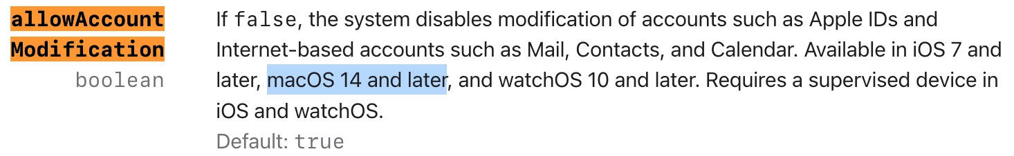 <?xml version="1.0" encoding="UTF-8"?> <!DOCTYPE plist PUBLIC "-//Apple//DTD PLIST 1.0//EN" "http://www.apple.com/DTDs/PropertyList-1.0.dtd"> <plist version="1.0"> <dict> <key>allowAccountModification</key> <false/> </dict> </plist>