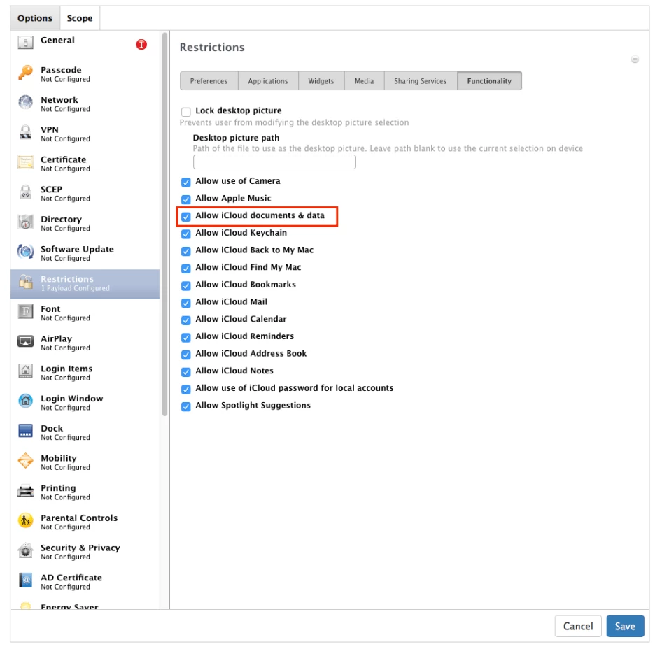 This option is also available in Casper 9.96's profile options, by unchecking Allow iCloud documents & data