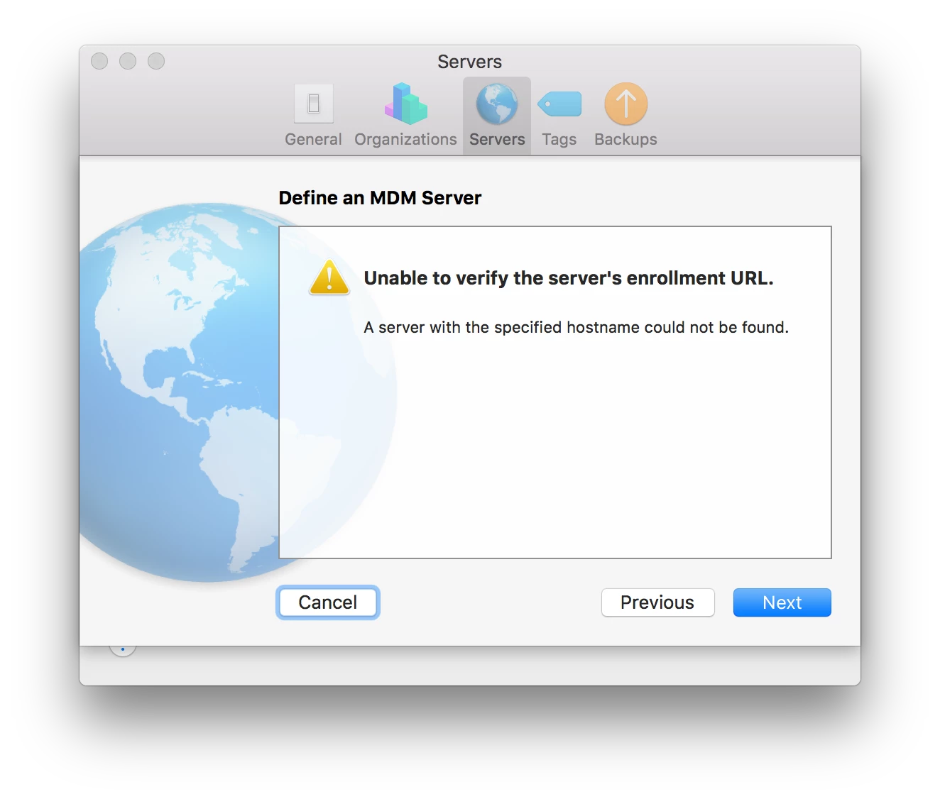 I'm putting this out there in case anyone searches for this error. In Apple Configurator 2, in Preferences > Server, when creating a new server, you may see an error with "Unable to verify the server's enrollment URL".