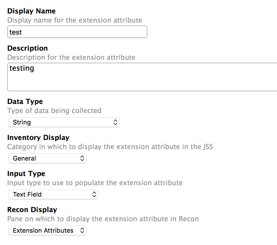 Coming around to this again as I try to figure what I am doing wrong. what are the setting I should set for the extension attribute inside the JSS console.
