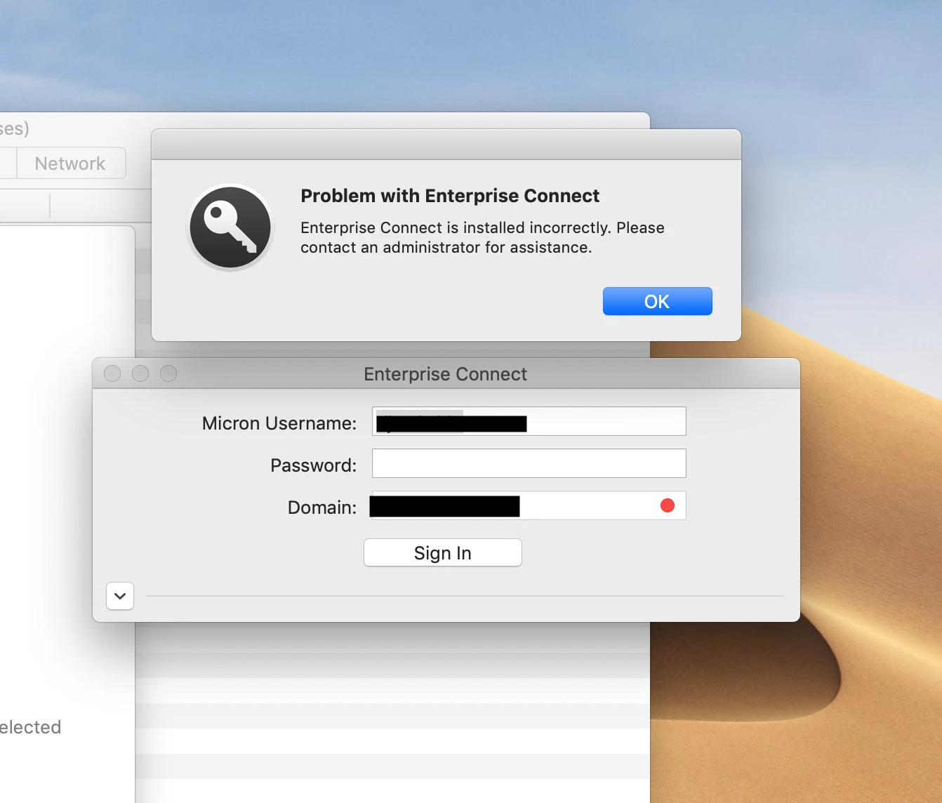 I'm getting a first-time error like this since using Enterprise Connect. I tried a clean installation. EC installing Corretely and user also able to enter your credentials. Once the user restarts your machine then only getting below error.
