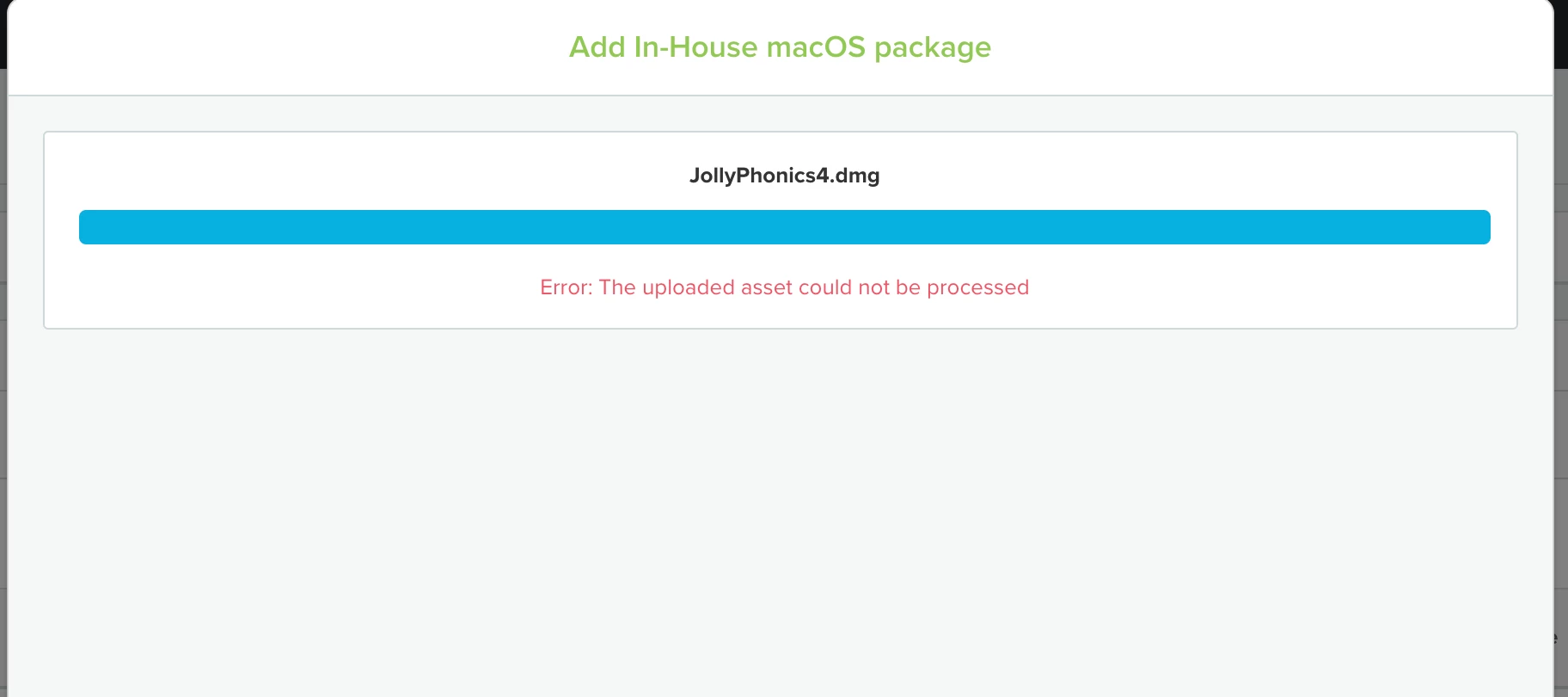 I am trying to upload a dmg to Jamf School for an Application that isn't in the App Store and I get an error on the upload.