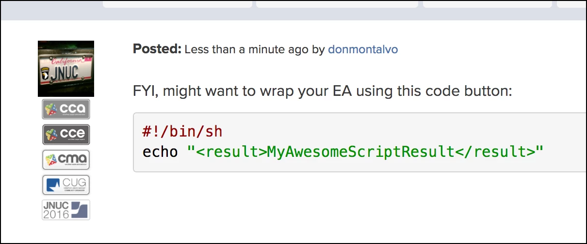 HI Everyone, I could use some help with this EA. I am using the EA exactly as @MandyDroid posted above. On the first Inventory report it will report the exact version that is installed. However, on subsequent reports to Jamf Pro, the same machine(s) will report as "Centrify Not Installed" or vice versa . While every Mac we have has Centrify installed, approx. 15% show a version number, the others "Centrify Not Installed" and it appears to be random. I am have trouble figuring out just when the EA picks up one result vs. the other. Can anyone see in the script were this might be occurring or why the server is getting different results? Any help troubleshooting this EA is greatly appreciated as I have an upgrade of the Centrify client that I need to get going.