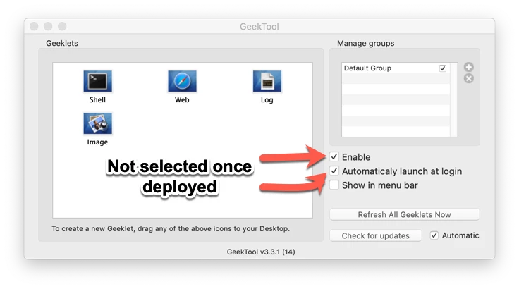 @ryan.ball I tried using your launch agent and it still doesn't launch on login. I've also tried building a DMG that contains the GeekTool app and the 3 preference files it has (org.tynsoe.geeklet.shell.plist - org.tynsoe.GeekTool.plist - org.tynsoe.geektool3.plist) and it still doesn't launch on boot or start as "enabled". I'm not sure what else to do at this point. I thought surely after getting the plist files that are configured to have "enabled" and "automatically launch on login" select it would work.