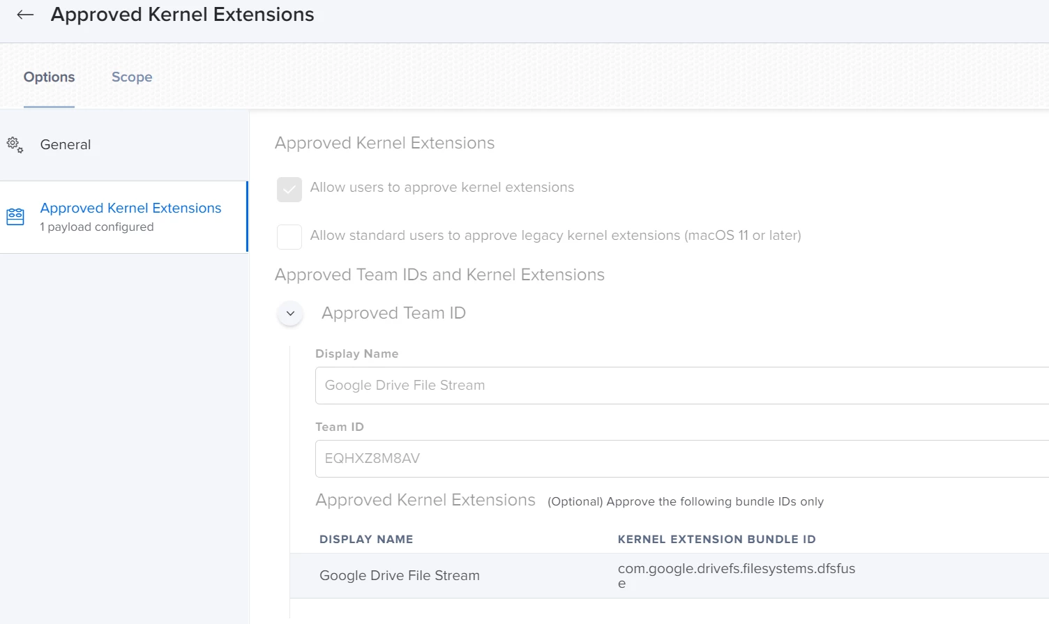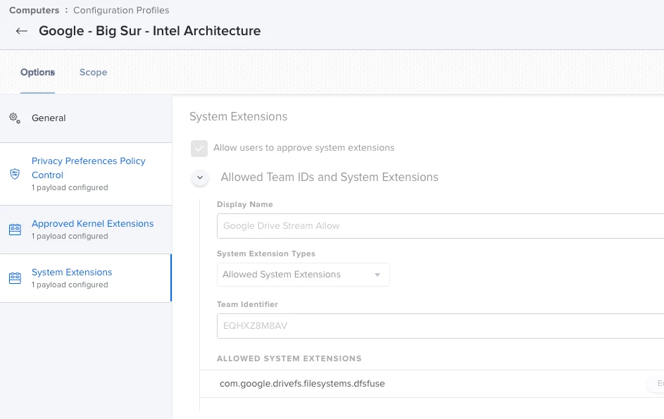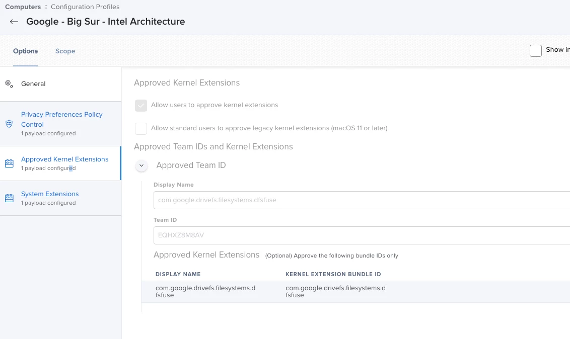 Big Sur Intel: The above payload does not work, in fact it gives an error when trying to apply if you look at the logs. Using a system extension payload does not work either, and even trying to get the values to put in the system extension payload off a GDFS install on these systems is a challenge. Per Apple's security changes there is no way to pre-approve a system extension via MDM controls on Intel Macs running Big Sur. Direct user action with admin rights is required to approve the legacy extension when prompted on first run.