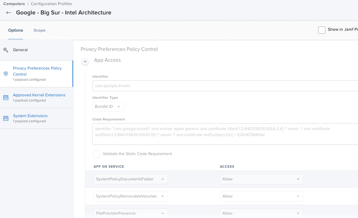 So what's a bit messy is that Google Drive seems to have both kexts and system extensions and it uses either depending on the architecture. So our config for G Drive on Intel and Big Sur has got a PPPC, Kernel and system extension. The M1 config only has the system extension approved.