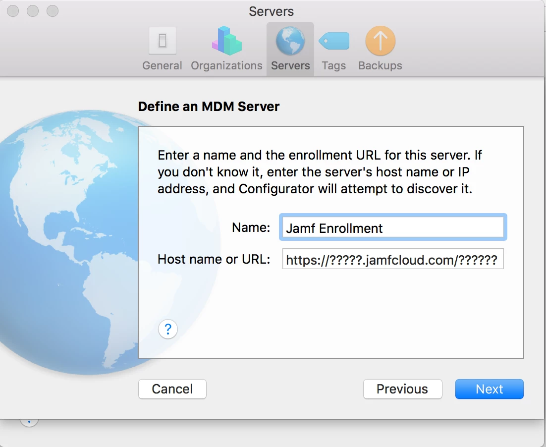 I am using configurator to enroll our devices. Can someone please point me to the correct URL for Jamf cloud servers? There is no documentation.